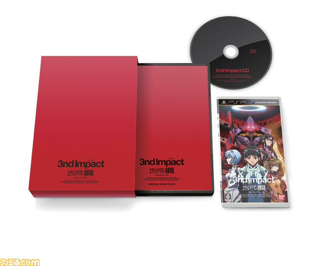 《EVA新剧场版-第三次冲击-》将分普通版、期间限定生产版、完全限定版三种版本发售。期间限定版将增加游戏原声音乐CD和特别封套,而完全限定版除了原声CD外,更有潮流装备的主题T恤和随身耳机!再加上特制包装盒。三种版本的售价分别为6280、8380、11530日元。