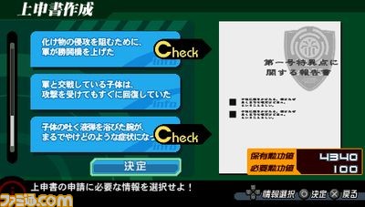 在防御模式内与子体的战斗收集的、对特异点攻略相关的情报进行取舍选择。报告书作成。